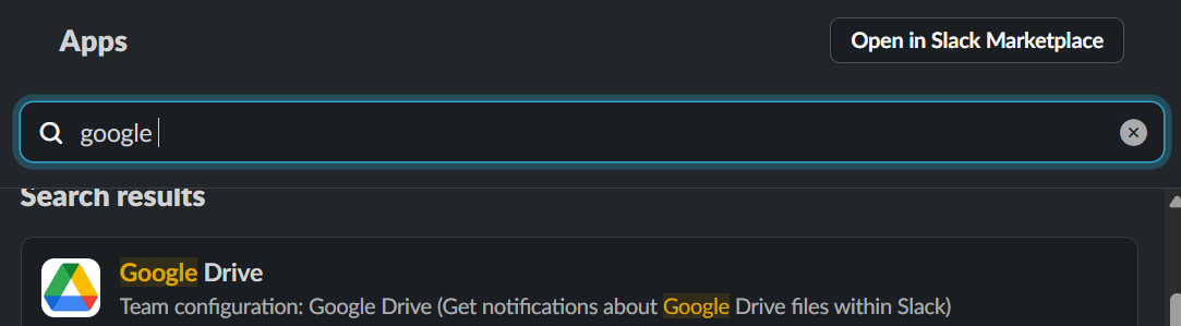 - Bước 3: Gõ tên app muốn kết nối với Slack vào ô Search Bar. Trong trường hợp này là Google Drive và Google Calendar